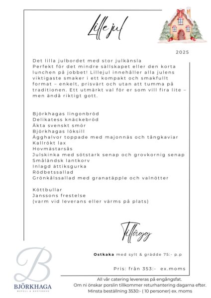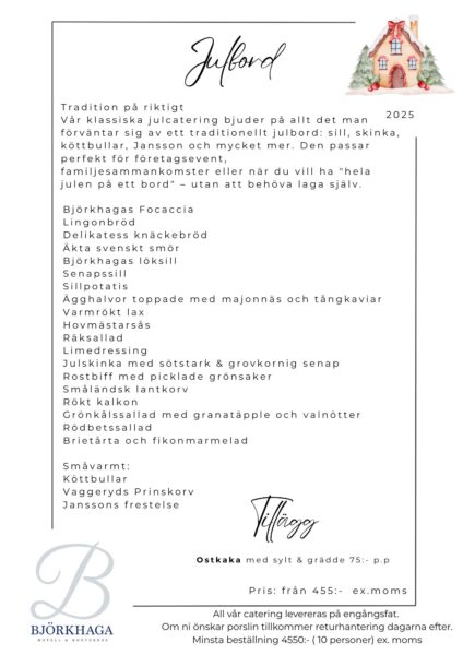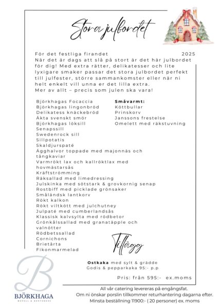 Välkomna att boka er julcatering i från oss på Björkhaga Hotell & Konferens. Vi erbjuder ett komplett, klassiskt julbord och ett lite mindre julbord som catering och även en färdig jultallrik och småvarmt. Du kan läsa mer om vad som ingår i de olika alternativen och vilka tillval man kan göra längre ner på denna sida.